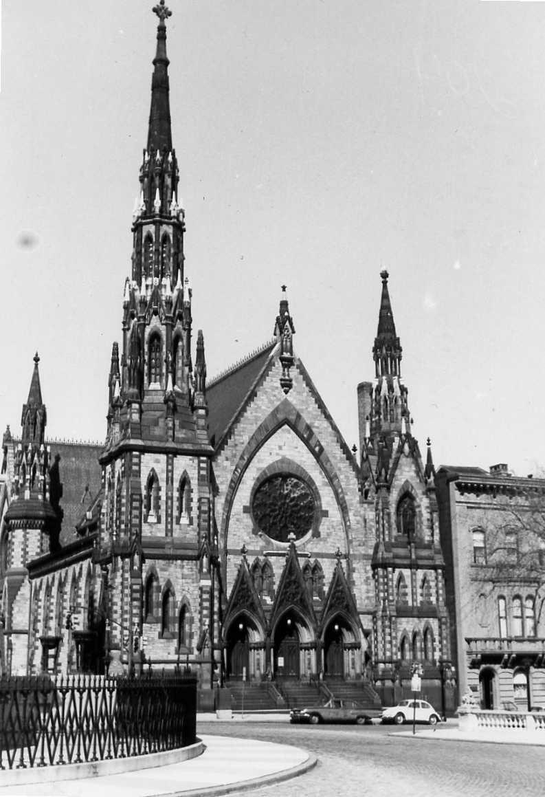 Designed in the Norman-Gothic style by Thomas Dixon, a Baltimore architect, Mt. Vernon Place United Methodist Church was completed in 1872 and stands on the northeast corner of Charles Street in Mt. Vernon Place, Baltimore. Blocks of a unique metabasalt, a green-toned Maryland fieldstone, were used for the solid wall surfaces; “true stone” rather than veneer. Windows, entrances, building edges, and corners are done in brownstone, as is most of the ornamentation. Aisle roofs slope gradually to a strip of clerestory above which rises to a sharply peaked roof. This lofty impression is re-emphasized by three spires. The vertical lines of the largest spire on the southwest corner of the church echo the lines of the tall columnar Washington Monument in the center of the square. This largest spire, and a smaller one on the southeast corner, frame the south and primary façade. Broad stairs lead to the triple entrance crowned by a free-standing, glassless, three-point "comb" of Gothic tracery. Above and behind the "comb," a large rose window ornaments the wall, recessed within a large pointed arch of brownstone which serves as a frame for both window and "comb." The western wall as a street façade adjoins the great spire and runs north in a series of pointed arch windows separated by thin buttresses. These are applied to the west wall and taper at a sharp angle toward an entablature below the aisle roof. Contained in its frieze are a number of distinct and individual faces, one of which is recognizable as Charles Tireman, a wealthy Baltimore merchant. North of the west wall a smaller spire abuts the crossing. The west wall simulates the principal façade, having a similar brownstone relieving arch enclosing a rather large rose window. The sharply peaked crossing roof is lower than that of the nave. The interior is noted for its iron columns, carved wooden beams, and stained glass Connick cross over the pulpit.
