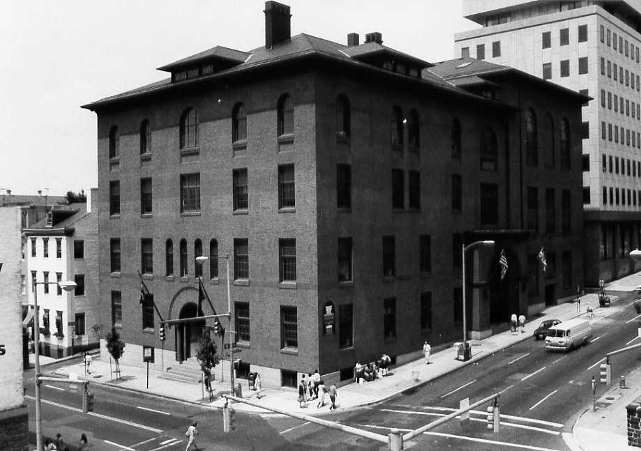 The Odd Fellows Hall is a notable version of the Romanesque Revival style which displays a high level of brickmasonry craftsmanship. A late 1970s adaptive re-use project retained most of its exterior architectural character while providing modern office space in the renovated interior. The building is also significant as the second home of the International Order of Odd Fellows in America. The IOOF was founded by Thomas Wildey in 1819 in Baltimore. The first Lodge was on Gay Street near Fayette, built in 1830. When the Order outgrew that building, the present Hall was built in 1890-91. During World War II, the U.S.O. occupied the northern section of the Hall and, with a short break between 1945 and 1951, remained at that location until 1975.