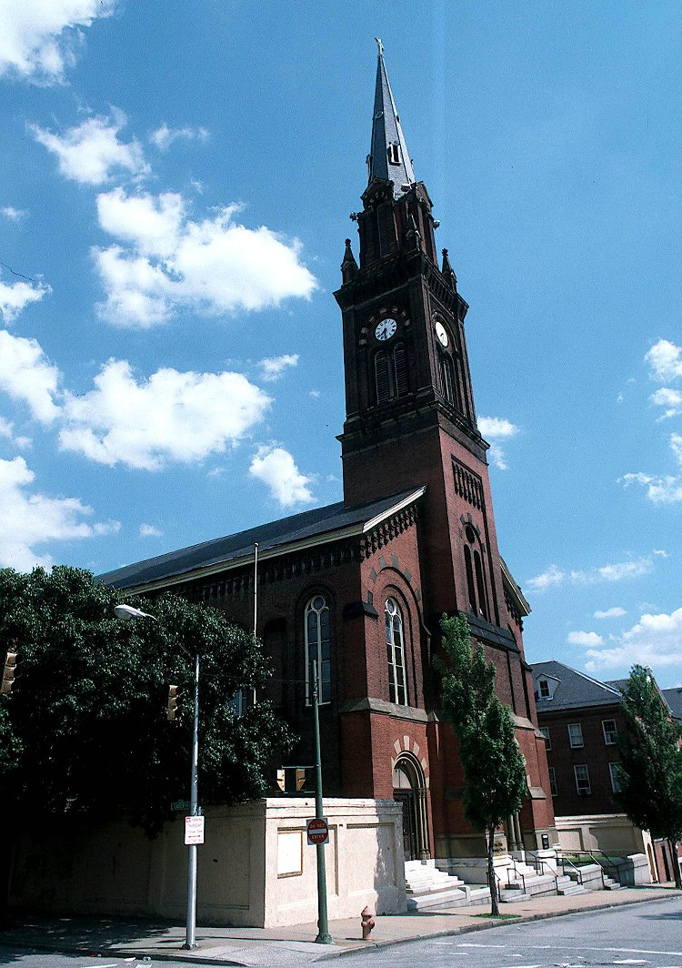The significance of Saint James the Less Roman Catholic Church is derived from several sources. As a building designed in the High Victorian Gothic style with Romanesque Revival overtones, the church is an example of a type of architecture that was commonly used in Baltimore in the second half of the 19th century for church structures. This church is an unusual example in that it is constructed of brick rather than the more commonly used stone, particularly for buildings of similar size and lavish treatment. The structure achieves additional significance as an early work of George A. Frederick (1842-1924), a prolific and prominent architect in Baltimore who designed buildings of all types mainly in the Baltimore area but also across the state. The craftsmanship of the period is apparent in the detailing of the construction of the building itself as well as in the stained glass windows from the studios of Josef Mayer in New York and Germany; three large interior murals painted about 1886 by the German-born artist William Lamprecht; and marble sculpture work by the Baltimore sculptor Joseph Martin Didusch.