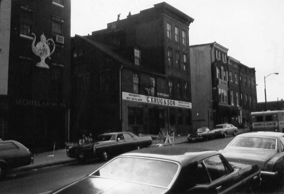 The G. Krug Iron Works is located at 415 West Saratoga Street, in the heart of downtown Baltimore. The lot on which the business is located is bounded by Jasper Street on the east, by Welsh Alley on the west, and a combination access road/parking area to the south. The front façade of the building fronts West Saratoga Street and rises in configuration slightly from east to west. The present building complex which now houses the company office and actual operating ironworks consists of three sections: 1) a two-story tall gable-roofed building dating from the first quarter of the 19th century, which houses the earliest shop, located at the northeast corner of the lot; 2) a four-story tall Victorian building which houses a business office on the first floor and storage rooms on the upper floors, situated on the northwest corner of the lot; and 3) a three-story tall shed-roofed addition dating from 1870-1880, located at the southeast corner of the lot, which houses the expanded shop, and a smaller two-story shed-roofed addition, which also houses portions of the expanded shop facility.