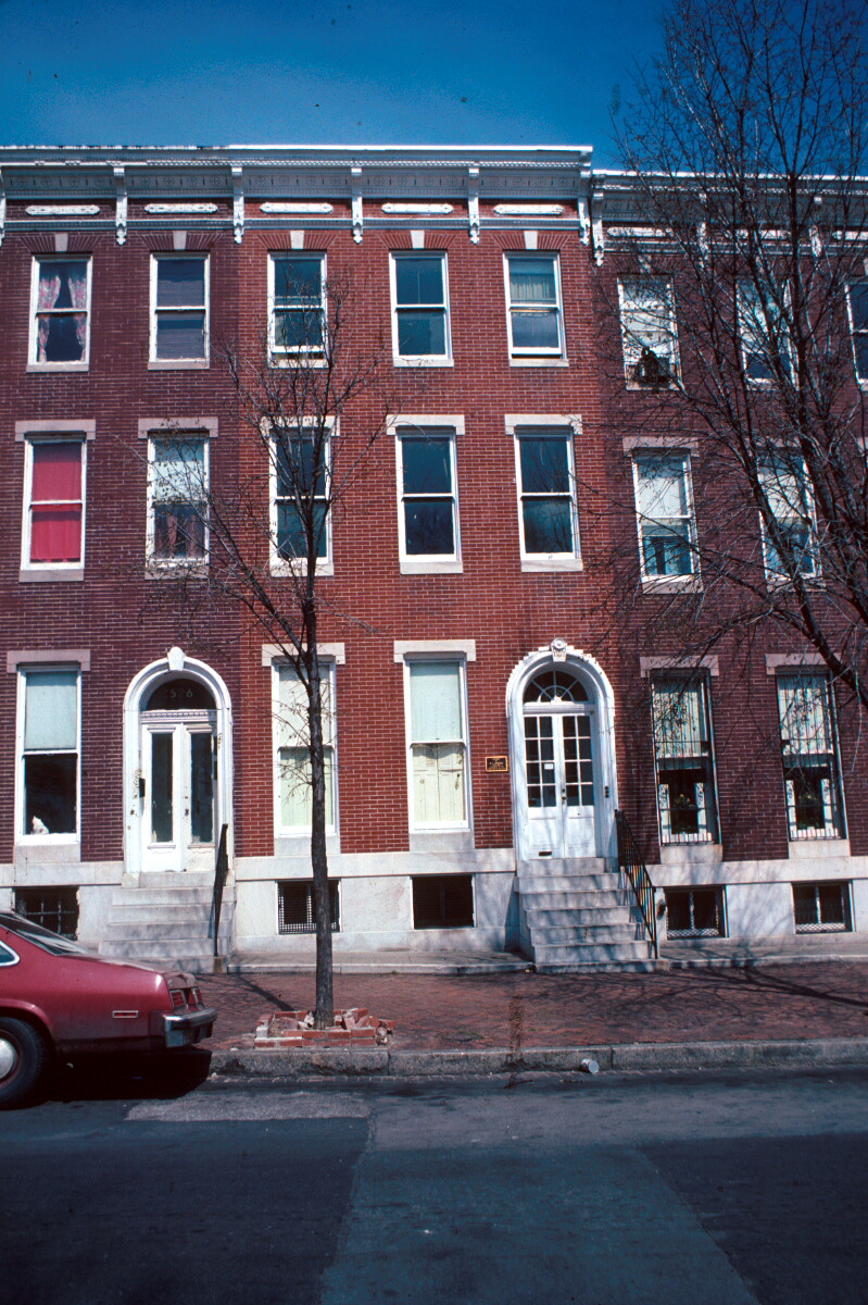 The H.L. Mencken House is a typical middle-class Baltimore row house of the late 19th century. Built in the early 1880s, the house is characteristically of common bond brick construction with Italianate decorative detailing. The facade or south elevation is three stories high, three bays wide with 1/1 sash windows, crowned by a bracketed wood cornice, and rests on a marble foundation. The principal entrance is in the east bay of the south facade, and consists of a double door with a round-arched transom and boldly molded surround. A telescoping rear wing projects to the north. The one-story extremity of the wing was built about 1923. A garden enclosed by a brick wall and wooden fencing and featuring a pergola and sculpture extends from the back of the house to Booth Street. Although some changes were made to the property in recent years, the house and garden remain intact for the period of Mencken's occupancy, 1883-1956. The principal interior woodwork consists of architrave molding. The house is entered through a small vestibule with paneled walls and marble flooring. Entrance into the main or stair hall is through a set of glazed double doors, one of which bears a brass plaque inscribed with Mencken's father's name. The staircase has turned balusters and newels and decorated stepends, and rises to the third floor. The ceiling in the front parlor is divided into panels by plaster strips and has a cornice and central molded medallion above a chandelier. The front and back parlors are connected by a rectangular doorway with paneled pocket doors.