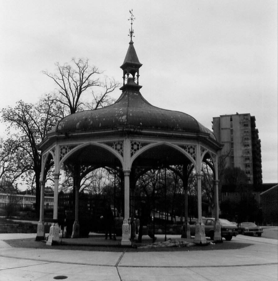 The Perkins Square Gazebo is a unique architectural structure in Baltimore City, because of its function as a shelter for a spring, its eclectic design, and its cast iron construction. This structure and the gazebo in Union Square are significant as reminders of a time when many fresh water springs were a vital part of Baltimore’s water system and recreational amenities. While the Union Square gazebo is classically designed, the Perkins Square structure represents the high degree of ornamentation that was popular in the Victorian era. The eclectic blend of architectural elements produced a fanciful pavilion that functions to delight and attract people to the former spring and public park. The cast iron character of the gazebo is also significant as a representative of this type of construction, because Baltimore was a leader in both its production and use in the mid to late 19th century.