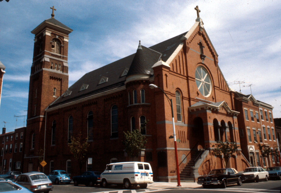 Saint Leo’s Church is located at the southeast corner of Exeter and Stiles Streets in the Little Italy section of East Baltimore. It is built of brick with stone trim, and has an asphalt shingle roof. Stylistically, the church combines Italianate, Romanesque, and Classical elements. Built in 1880-1881, the gable-front church is three bays wide and five bays deep. Its features include a high entrance porch, a turret with conical roof on the north wall, a square bell tower at the northeast corner, a large rose window in the main façade, and a variety of decorative brickwork. On the main (western) elevation, a large two-story extension protrudes from the center of the façade. At the ground level of this extension there are three segmental arches---the center one containing a door and the other two blind. Above these three segmental arches are three round arches that open onto an entrance porch. Above this porch, on the wall of the church itself, is the large round window inside a large arch. Above that is a small arched niche with a protruding shelf. Lining the gable of this central portion of the main façade is elaborate corbel work and stone coping. The porch and round window are flanked by two tall arched windows. The wall space above and below these windows is decorated with narrow recessed panels. The building has not been substantially altered since its construction, and thus its integrity is undiminished.