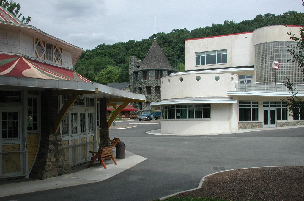 Glen Echo Park is an eclectic assembly of architectural styles which attest to the richly varied history of growth and change which the park has undergone. The Chautauqua Tower, a Richardsonian Romanesque structure of irregularly shaped, rough-faced stone, dominates the entrance to the park. Opposite the tower is the Dentzel Carousel, a whimsical structure of 1921 with a curved circular roof and elaborate and fanciful carved and painted animals in the Dentzel tradition of fine carousel building. Beyond the carousel is the Spanish Ballroom, erected in 1933 and reflecting many Spanish design elements, including stuccoed walls, an entry tower, projecting wood viga ends, and roof tiles. Designed by Edward Schoeppe of Philadelphia, the ballroom contains a 7,500 square foot dance floor built to accommodate 1800 dancers. The ballroom hosted big-name bands of the 1930s and World War II era. An original terrazzo floor leads through an arcade into the ballroom. Constructed in 1931, the Crystal Pool was designed by Alexander, Becker, and Shoeppe of Philadelphia, who specialized in amusement park swimming pool designs. Designed to accommodate 3,000 swimmers at a time, the Crystal Pool was the largest pool in the area at the time. Only the art deco entrance pylon and part of the pool's retaining wall remain. The 1923 Bumper Car Pavilion is the oldest surviving amusement park structure other than the carousel and its house. The roof of the 55' x 95' frame building forms a broad bell-shaped curve at the gable ends, which are decorated with open latticework, and a pediment centered on the front or long side upon which is a painting of a bumper car. The Administration Building and Arcade are two buildings built in 1940, joined and presenting a continuous facade along their west sides. The surfaces are predominantly stuccoed. Two lighted towers bearing stylized vertical strips flank a theater entrance in the middle of the arcade, and shorter towers are on either side. The building is ornamented with projecting concentric medallions and a low banded cornice. A flat roof with banded edges on columns between the northeast end of the administration building and the Chautauqua Tower served as the covered walkway to the amusement park. The overall stylistic influence is art moderne. The park grounds also feature a 1947 "Cuddle Up Pavilion", a maintenance shop, and a picnic grove.