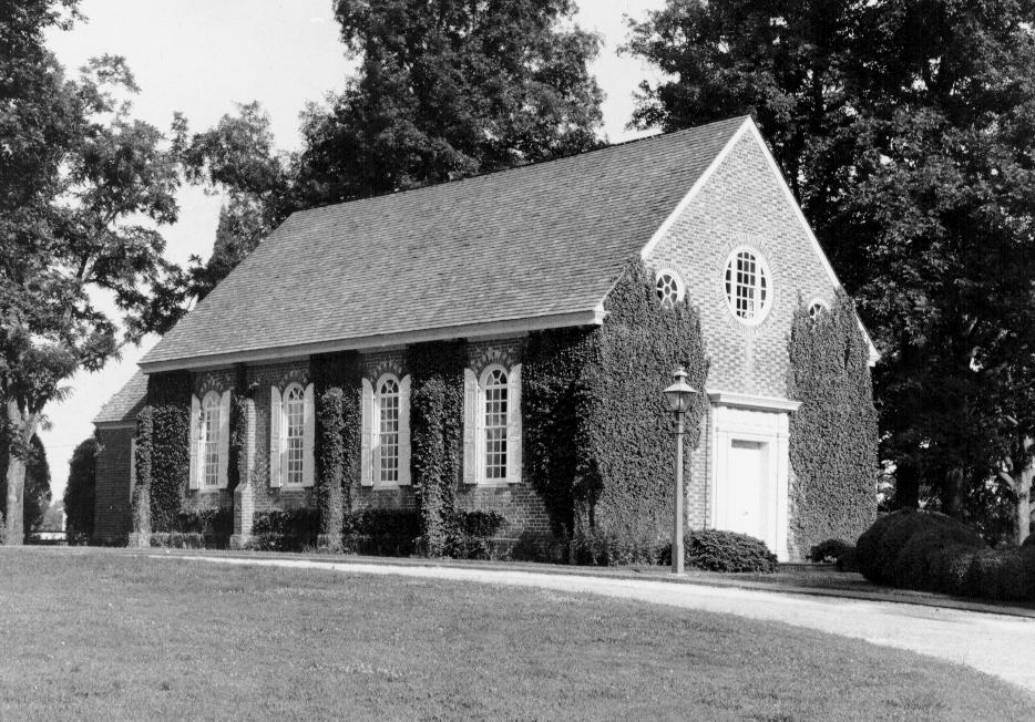 Old Wye Church is a one-story, gable-roofed, rectangular brick structure originally constructed in 1717-1721, extensively renovated in 1854, and restored in 1947-1949 to its 18th century appearance. The entrance is centered in the west gable, and features a Doric enframement with fluted pilasters supporting a full entablature. A large circular window (added in 1949) is centered in the gable above the entrance, and flanked by a small circular window on either side. The side elevations are four bays wide, defined by shouldered buttresses and holding semicircular-arched 12/16 sash. The main block of the church measures approximately 25' x 50'; a 16' x 18' chancel extends from the east gable. The chancel is one bay wide, with a Palladian window in its gable end. A small c. 1854 shed-roofed sacristy is attached to the south side of the chancel. On the interior, three rows of box pews are disposed according to a plan drawn in 1723. A hanging pulpit is centered on the north wall and is flanked by a lectern and reading desk. In the chancel, the altar rests on an elevated platform behind the altar rail with turned balusters. The ceilings of both areas are arched, and the nave floor is paved with brick. A gallery spans the west end of the nave. Northwest of the church stands a reconstruction of the 1761-1763 Vestry House, on its original foundation. Extensive documentary records, coupled with surviving architectural evidence, guided the 1947-1949 restoration.