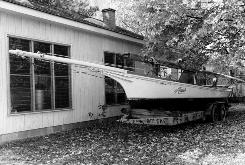 MAGIC is a sailing log canoe in the racing fleet. Built on St. Mary's Square in St. Michaels, Maryland in 1894 by Charles Tarr, the canoe measures 34'-3 5/8" long with a beam of 6'-11". She has a longhead bow and a raking sharp stern. Log-built, she has a lapped sheer strake topped with a rubrail. The boat is privately owned and has been raced by members of the same family since 1925. She has a white-painted hull, fiberglassed over, and varnished washboards and spars, with a white bowsprit and a long bumpkin. The canoe shows typical Tilghman-style 5-log construction in the hull, with a lapped uppermost (sheer) strake and rubrail. Strip-planked washboards form a peapod-shaped cockpit, lined with a varnished coaming and topped with short cleat railings amidships. There are solid stern sheets beneath the washboards at the stern and a wooden centerboard trunk placed well forward. There is a straight, raking bow with a small longhead and a sharp, raking stern, on which the rudder is hung outboard on pintles. A long bumpkin, painted white, overhangs the stern. The canoe carries moveable springboards for racing. The rig consists of two adjustable masts whose angle can be changed using wooden chocks. The masts are set into thwarts and mast steps in a "square" system. The mainmast, 47 1/2' long, is unstayed. The foremast, 34' long, is set up with two shrouds and spreaders set well down the mast. A forestay leads to the end of the bowsprit, which is set up with heavy standing rigging--a wire bobstay and two wire bowsprit shrouds. Foresail and mainsail are clubbed and have sprits; they are dacron sails locally made by Ellison. The canoe also carries a large jib and various light racing sails. The canoe’s hull is painted white, with blackish-green bottom paint and a racing stripe above the waterline. The name MAGIC is painted in large script gilt letters directly on the hull. The longhead is decorated with two parallel sets of stripe beading, white with dark red accents, rather than trailboards. The washboards are highly varnished, as are the centerboard and spars except for the bowsprit, which is white.