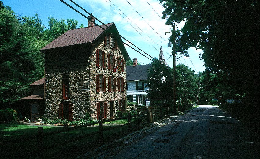 Dickeyville is a rare example of a complete 19th century mill town, including residential buildings, public buildings, and mill structures, which have survived unchanged to the present time. Structures easily discernable as representative of the four major building periods reflect the economic growth of the area. The original row of six stone worker’s houses built c. 1790 still stands, with their asymmetrically placed windows with small glass panes. The period of the Franklin Paper Mill (c. 1811) is represented by a stone and cement house at 5122 Wetheredsville Road, which has symmetrically placed windows and generally larger proportions. During the period of ownership by the Wethered family (1829-1871), more pretentious worker’s dwellings appeared, built of stone and painted white. Public buildings, such as an 1832 stone schoolhouse, and 1840s church, and an 1853 I.O.O.F. Hall survive from this era. (The school and church are now used as residences.) From 1871 to 1909, under the auspices of the W.J. Dickey Company, a number of stone and frame structures were built, mostly in the Victorian style. Examples include the 1872 mill warehouse of dark gray rubble stone and brick trim, the stone row at 2407-2411 Pickwick Road (c. 1874), and the 1872 building which was used as the mill office and jail. The cornerstone of the Dickey Memorial Presbyterian Church on Wetheredsville Road was laid in 1885 and the structure was financed by the Dickey family. The schoolhouse was expanded by frame additions to create a high school and primary school. In 1890 a clapboard building with hipped roof was erected which served successively as Mechanics’ Hall, the parish house of the Presbyterian Church, and finally a private residence. The mill, as it exists today, is the structure built by the Dickey Company in 1873 to replace an earlier mill which had burned. It is constructed of stone with brick trim, painted white overall, and is now used as a warehouse.